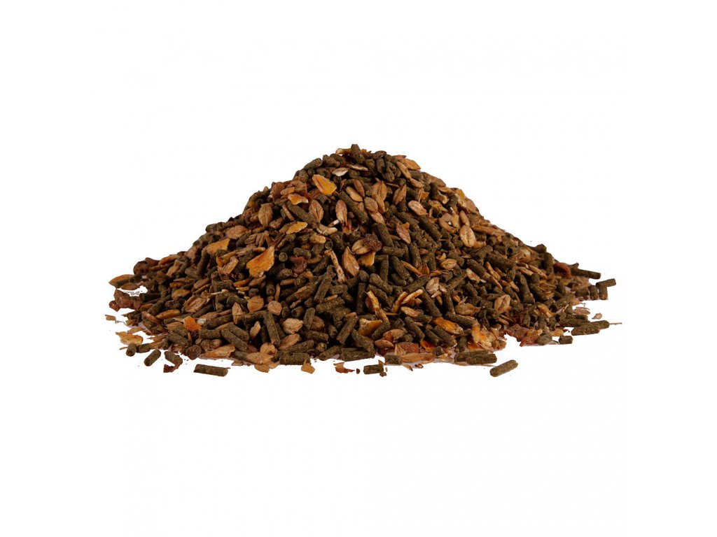 Jačmeň siaty, pšeničné otruby, lucerna-teplovzdušne sušená-granulovaná, sladový kvet, kukurica, pšenica, výlisky drene ovocie, melasa repná, mrkva sušená, uhličitan vápenatý, dihydrogénfosforečnan vápenatý, chlorid sodný, hydrogénuhličitan sodný.