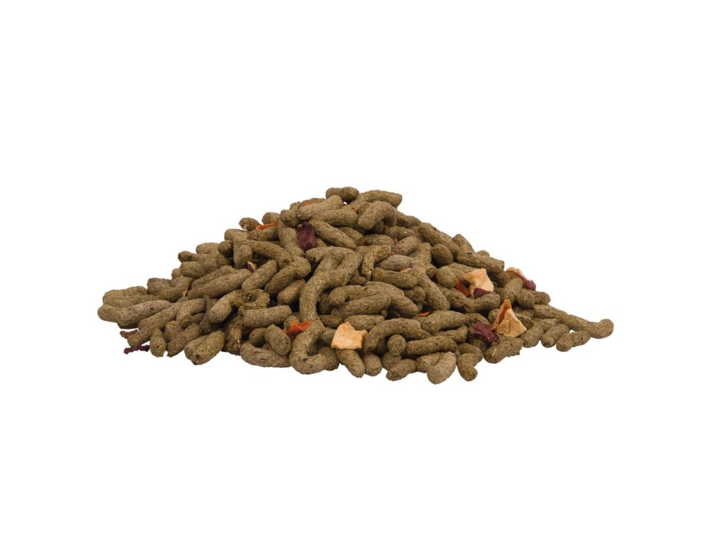 lucernové úsušky, jačmeň, ovos, kukurica, sušené jablká a výlisky, prírodný zdroj vlákniny, sušená mrkva, senné granuly, psyllium, hrach, sušené čierne ríbezle, sójový olej, sušená červená repa, karob, hydrogénfosforečnan vápenatý, kvasnice, zmes sušených bylín 0,9 %, sezamové semienka 0,5 %, ľanové semienka 0,5 %, chlorid sodný, kvasnicové výrobky, riasa Schizochytrium limacinum, juka.